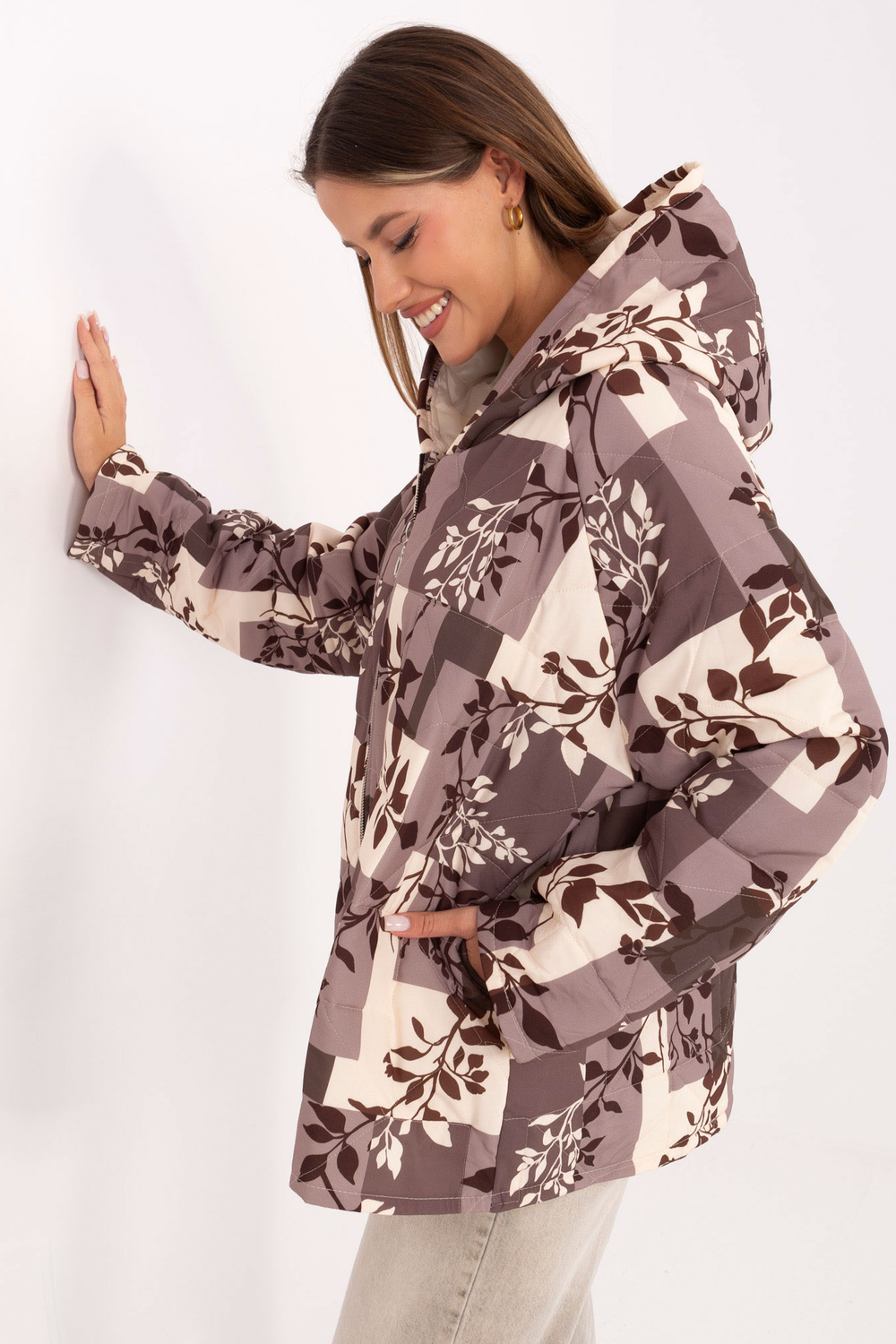 Modelis valkā viena izmēra apģērbu. Modeļa izmēri: augums 176 cm, krūtis 90 cm, viduklis 62 cm, gurni 94 cm.