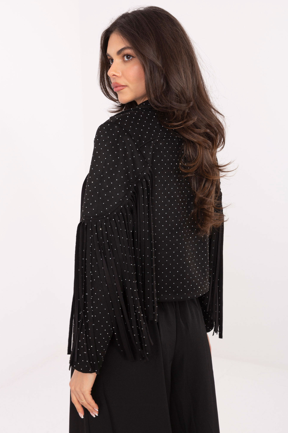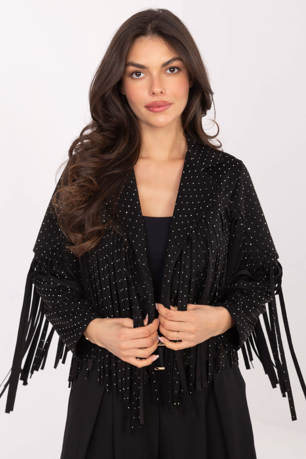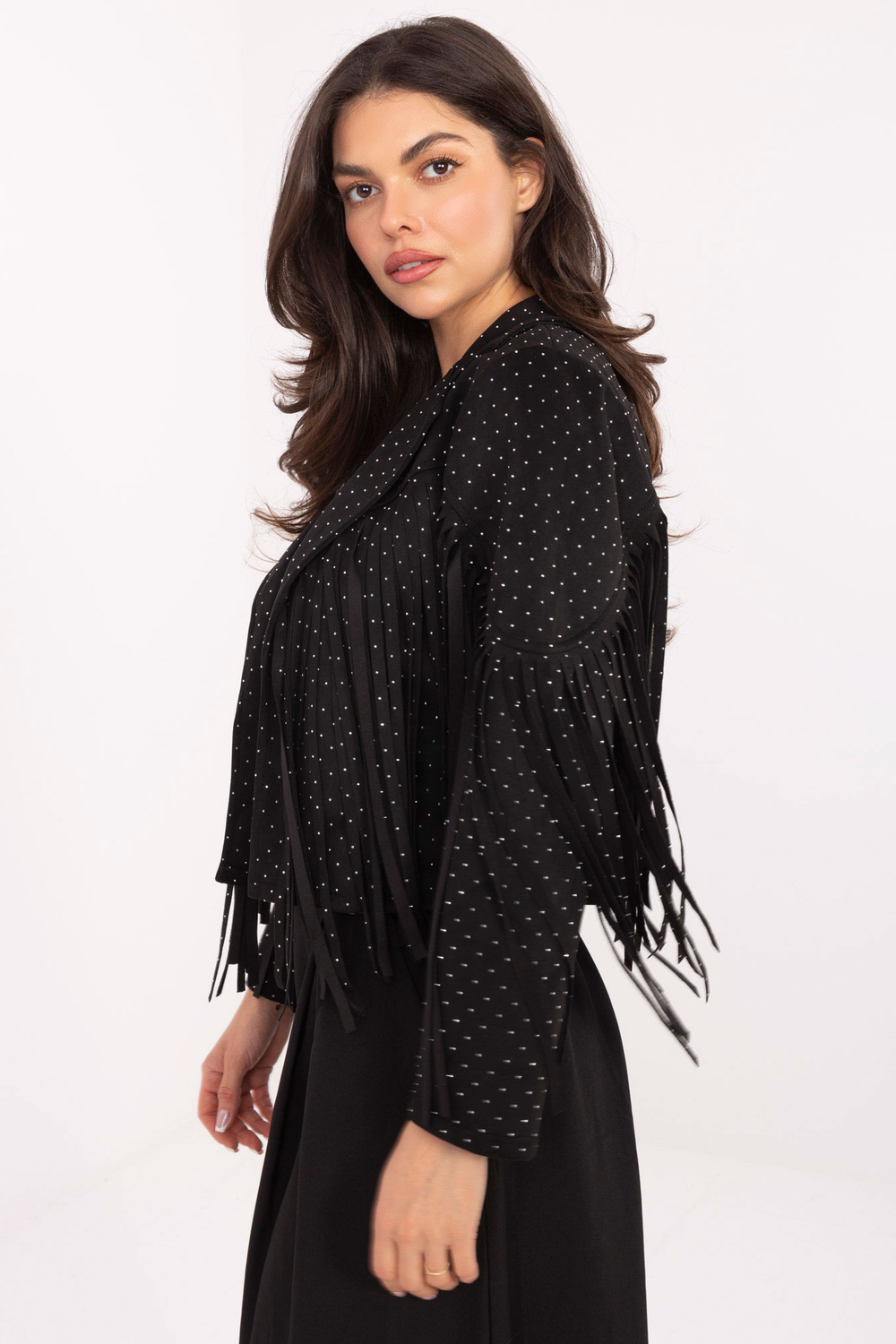 Modelis valkā one size izmēra apģērbu. Modeļa izmēri: augums 173 cm, krūtis 85 cm, viduklis 62 cm, gurni 95 cm.