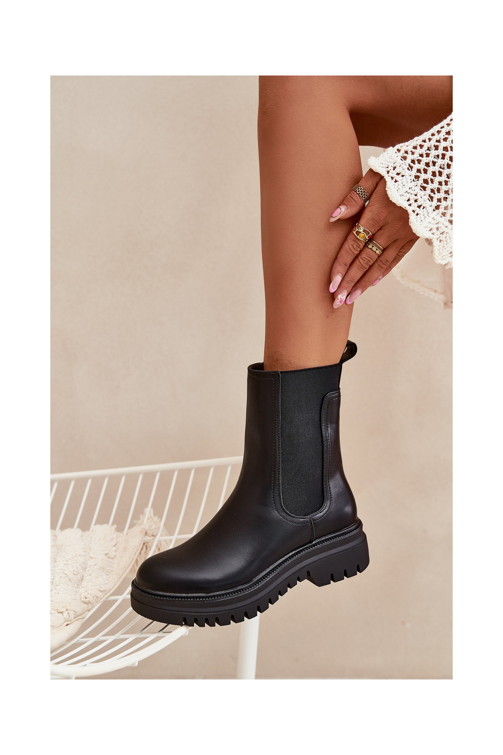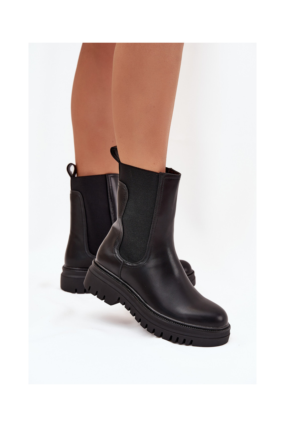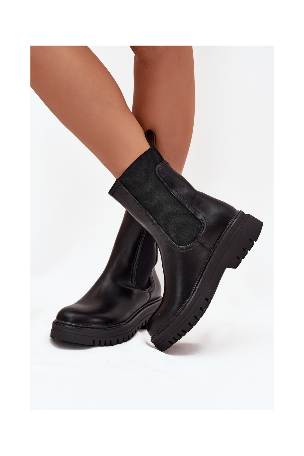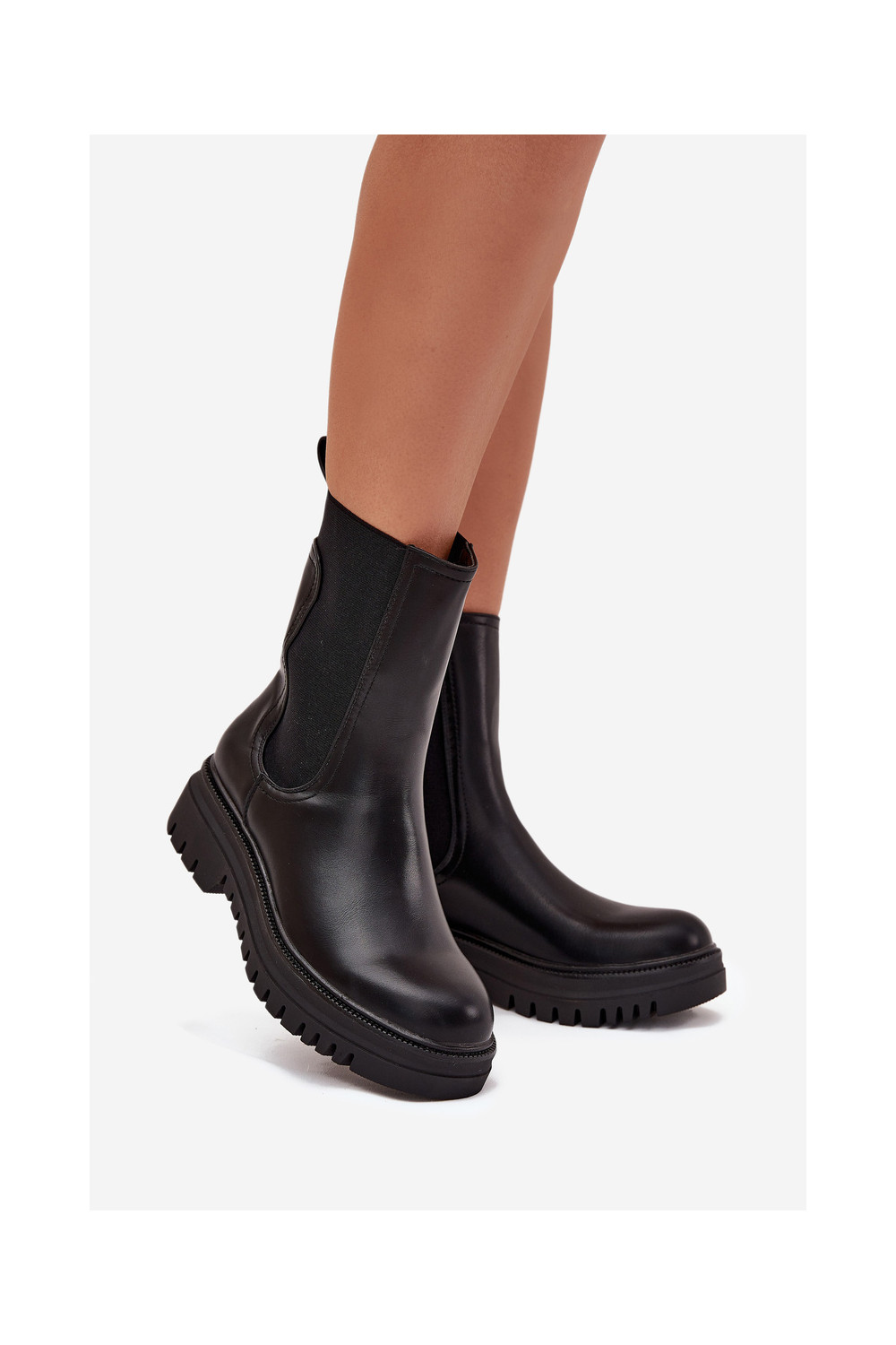 Stilīgi sieviešu zābaki ar platformu un plakanajiem papēžiem, ievelkamā modeļa, melnā krāsā Ravessa
