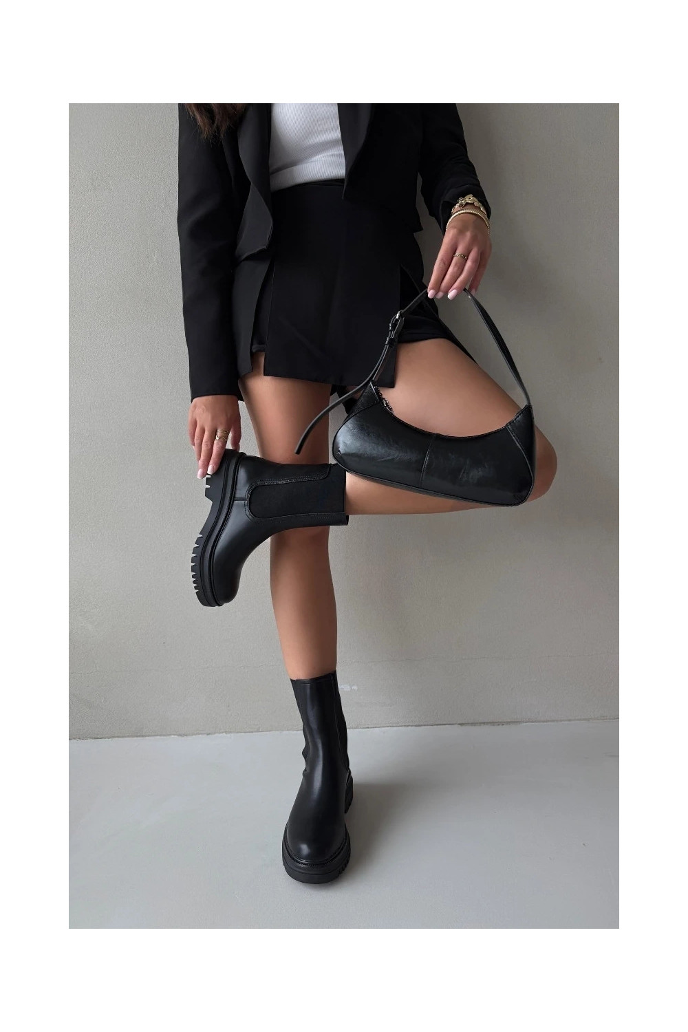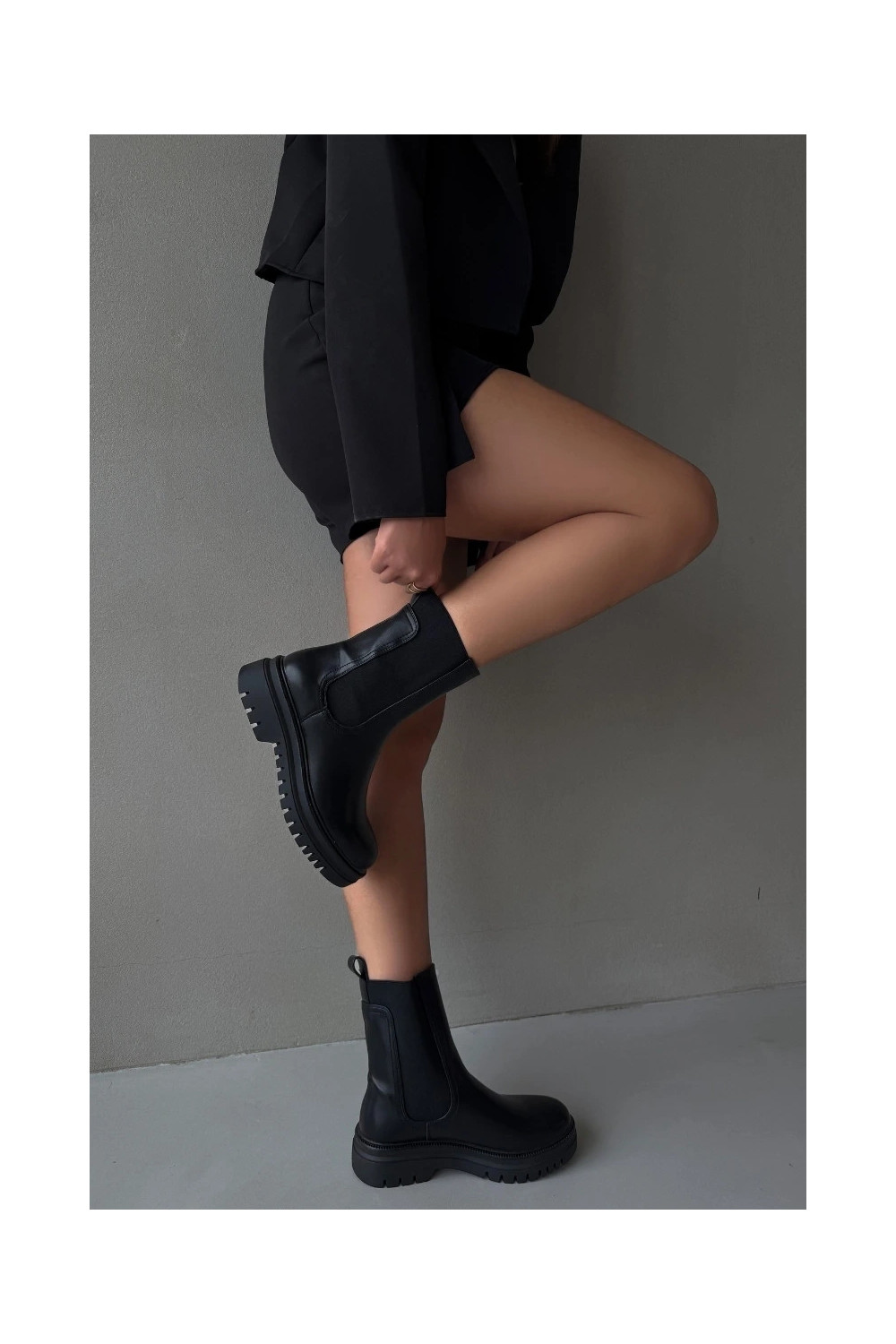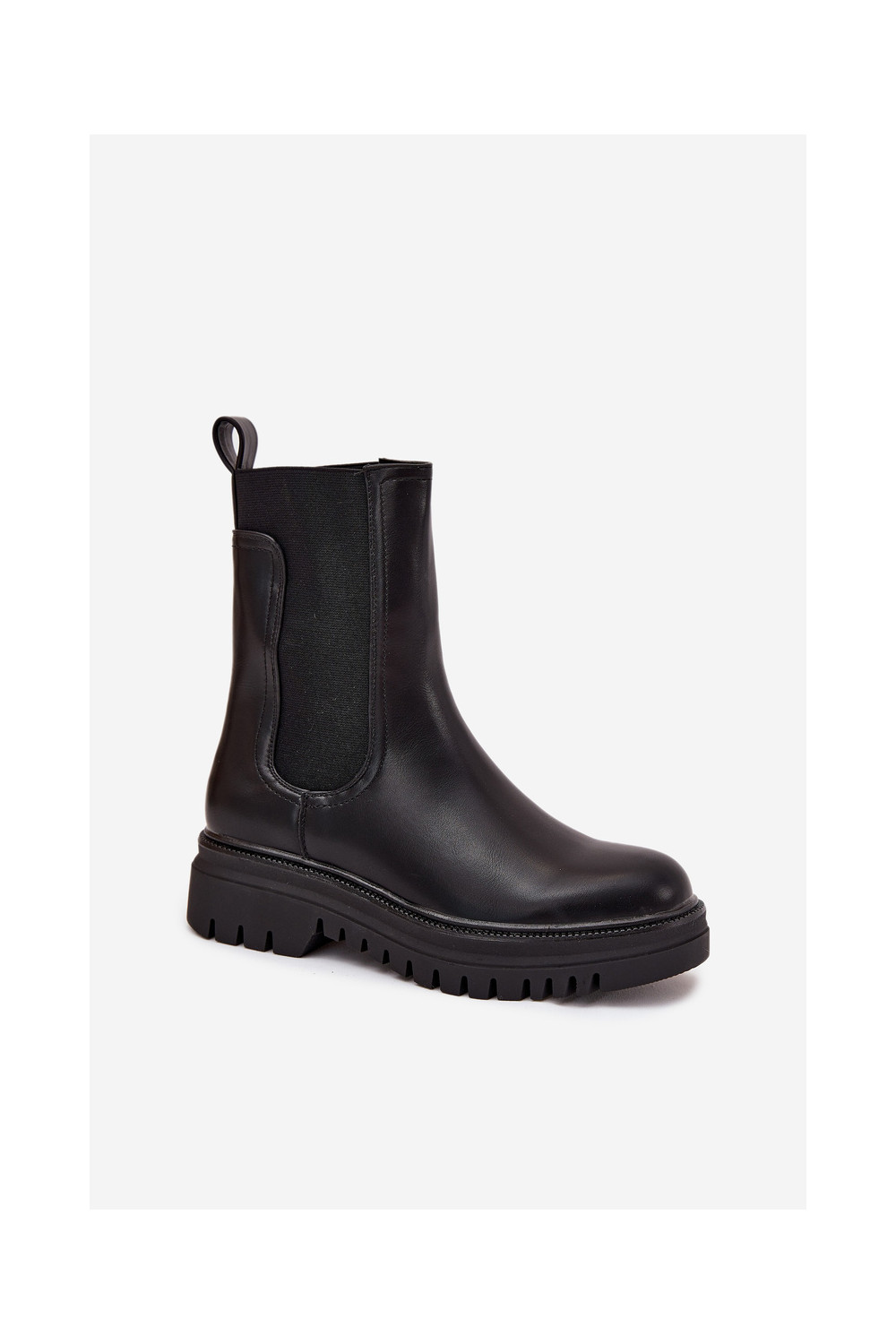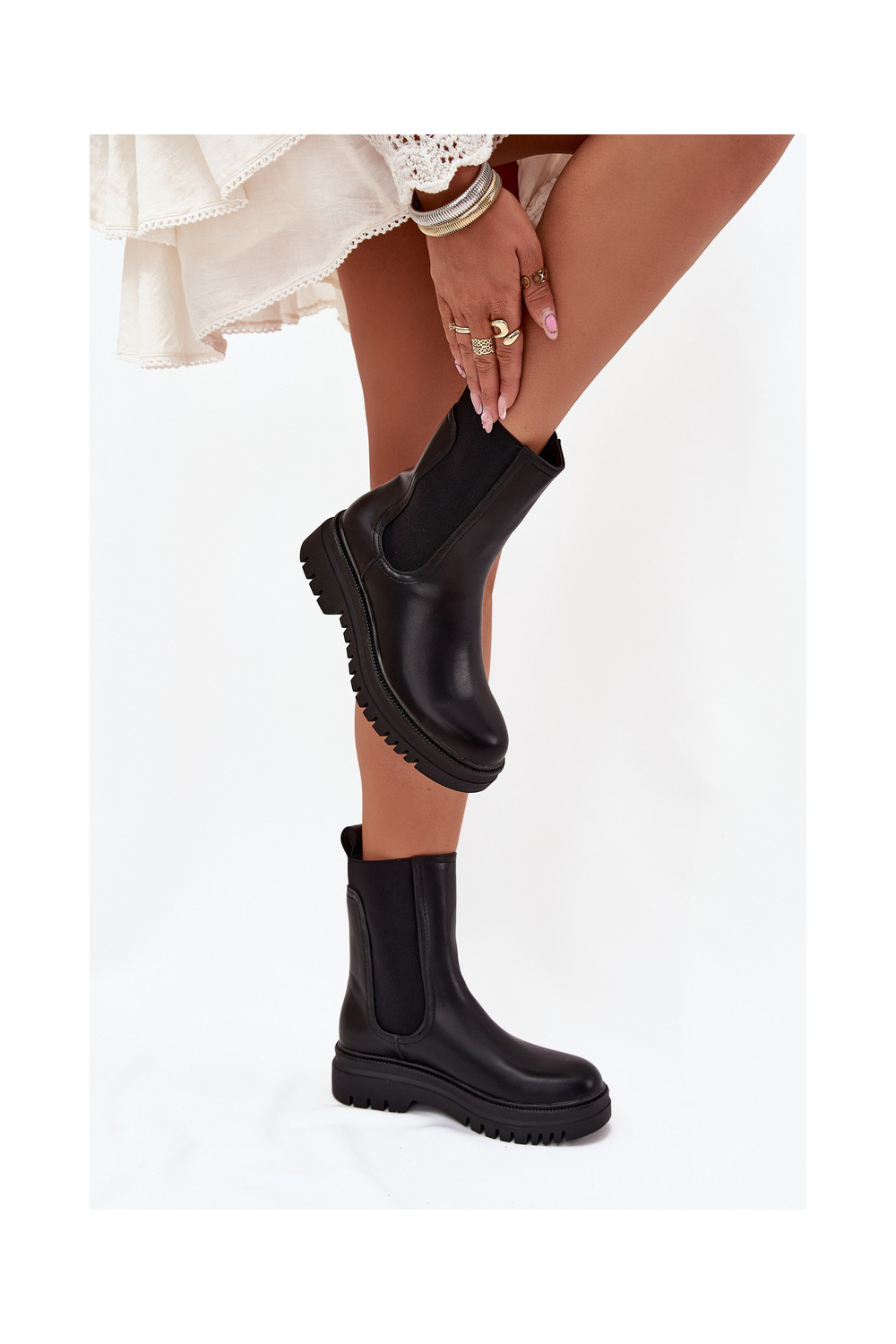 Stilīgi sieviešu zābaki ar platformu un plakanajiem papēžiem, ievelkamā modeļa, melnā krāsā Ravessa