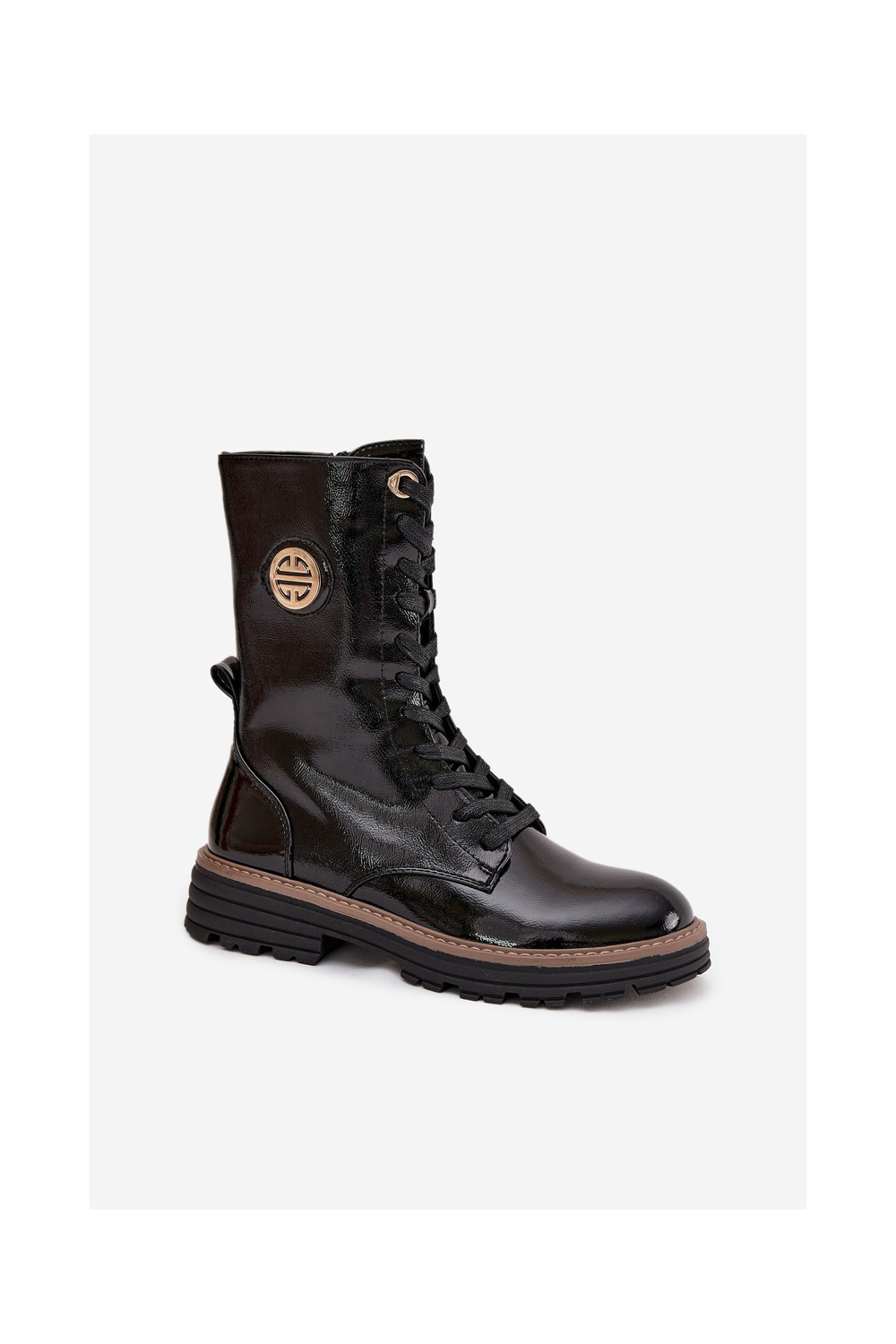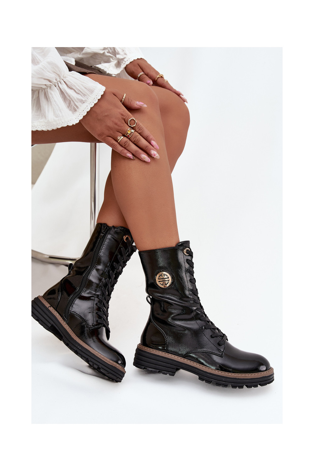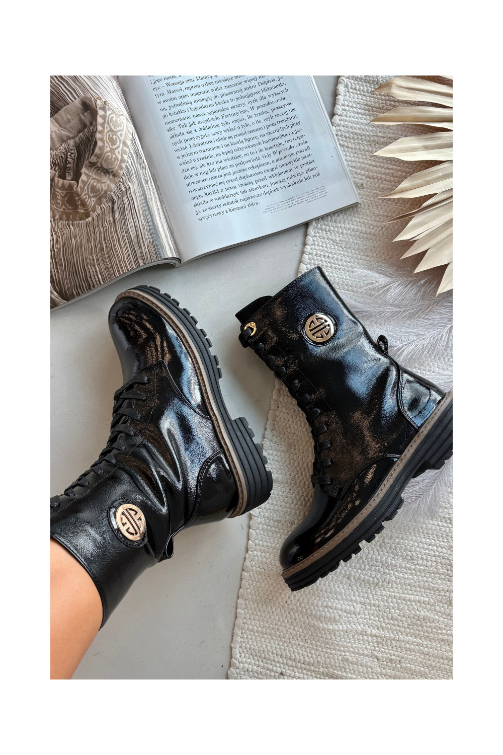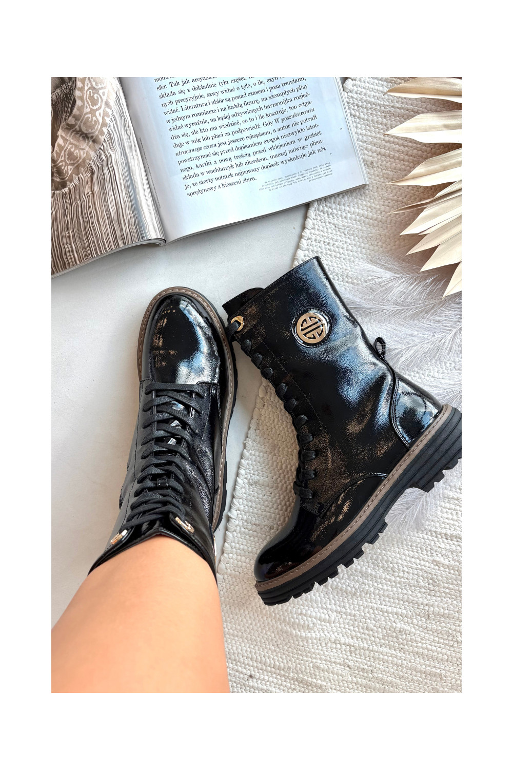 lakuoti darba sieviešu potīšu apavi ar zelta krāsas detaļām siltināti melnā krāsā Dorialine