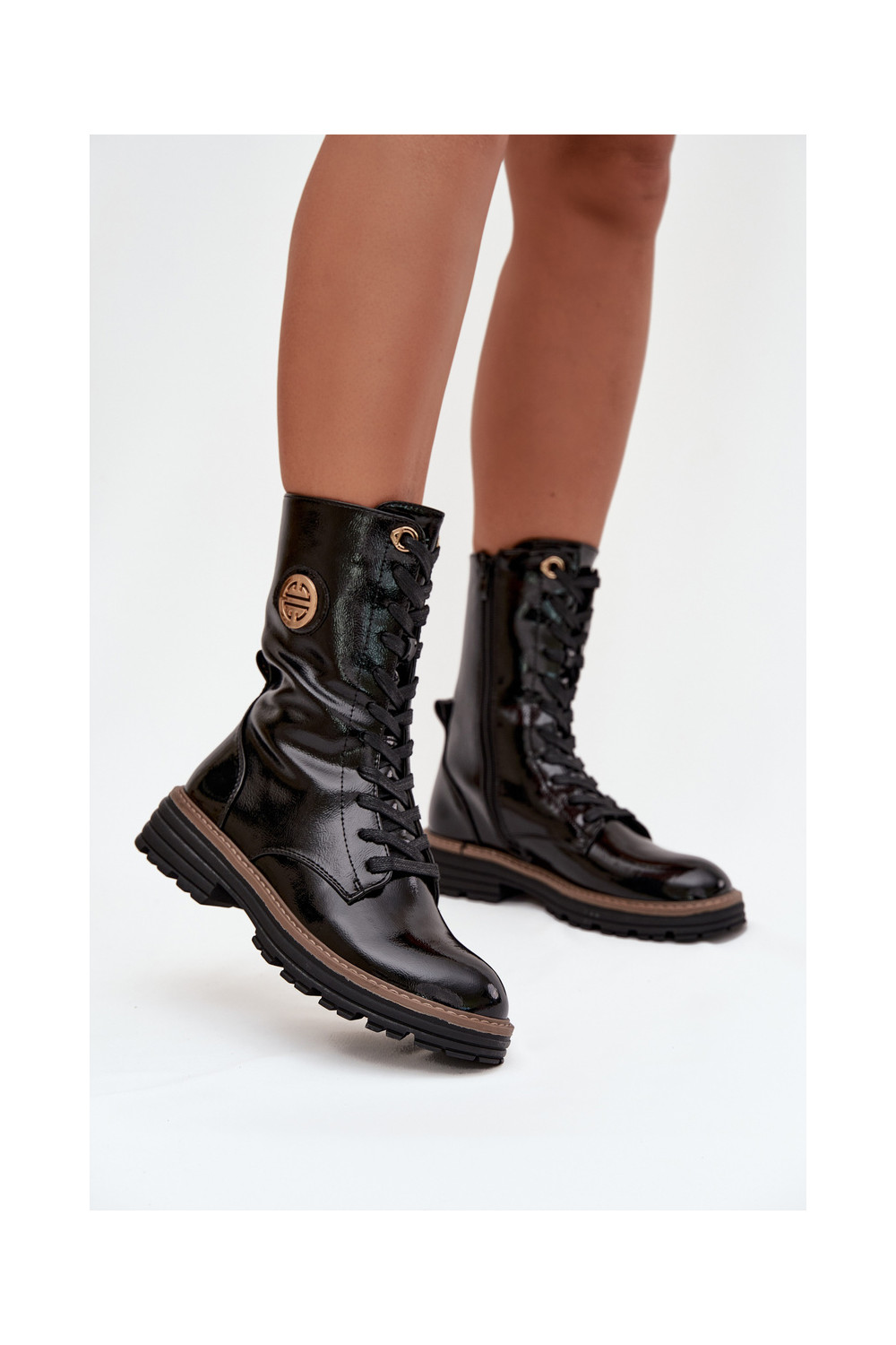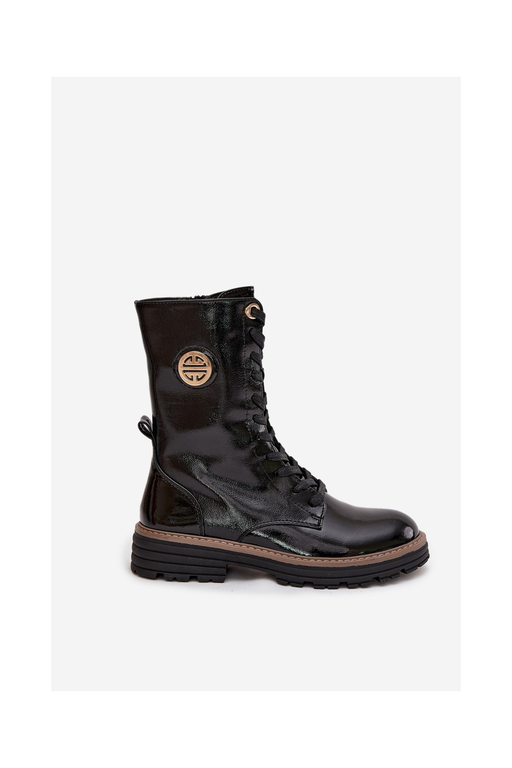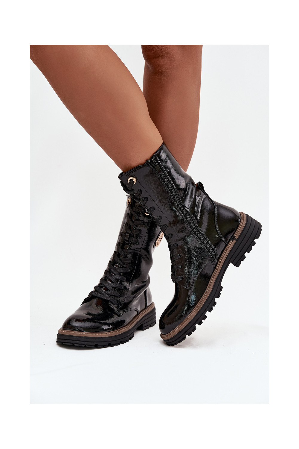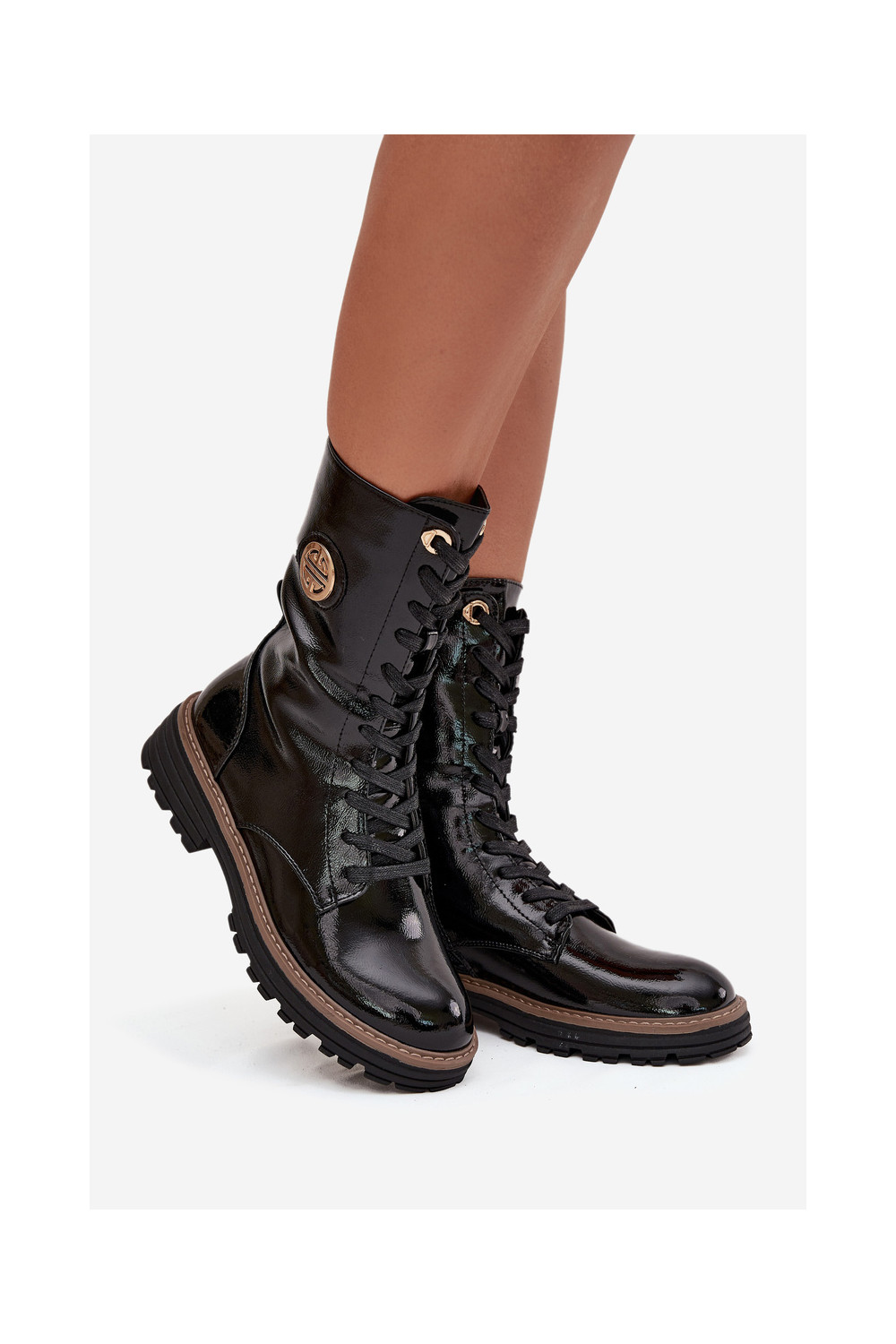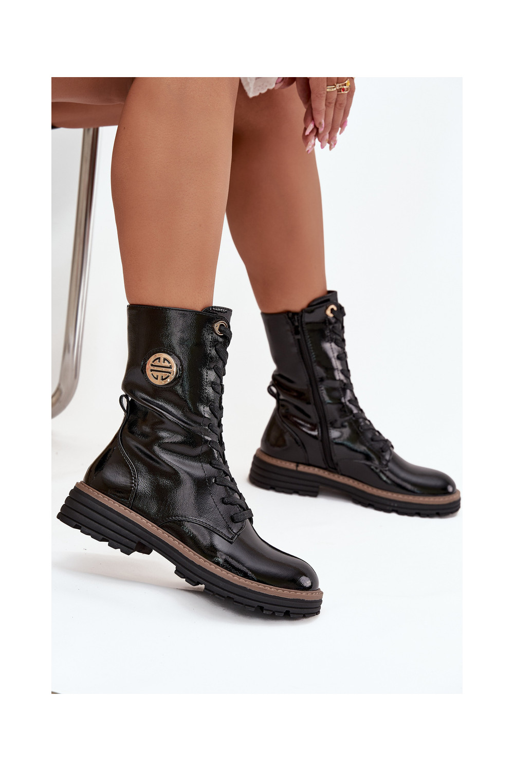 lakuoti darba sieviešu potīšu apavi ar zelta krāsas detaļām siltināti melnā krāsā Dorialine