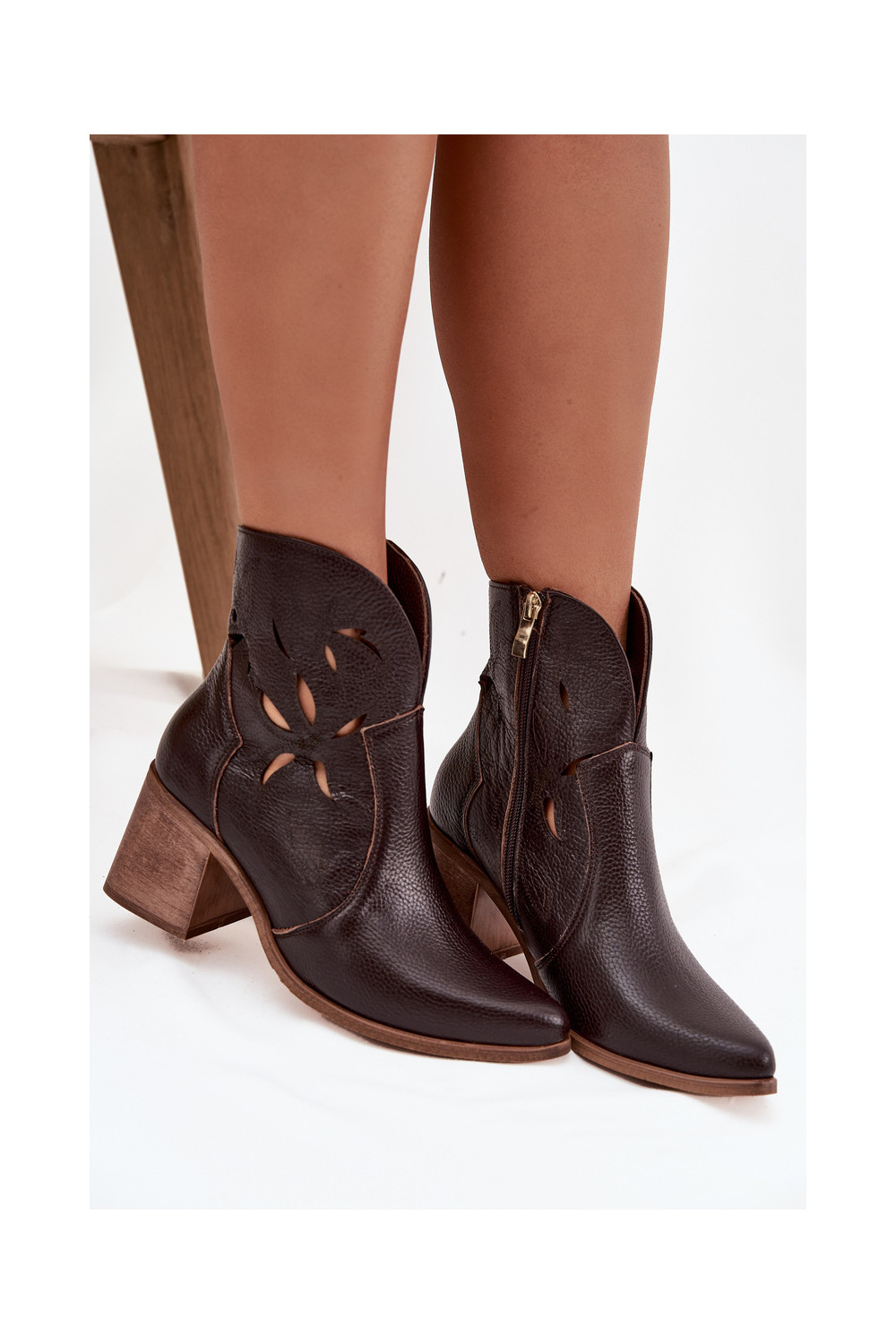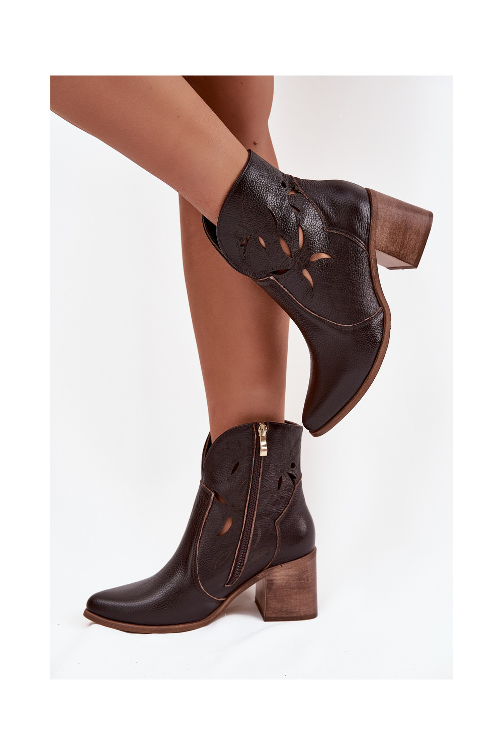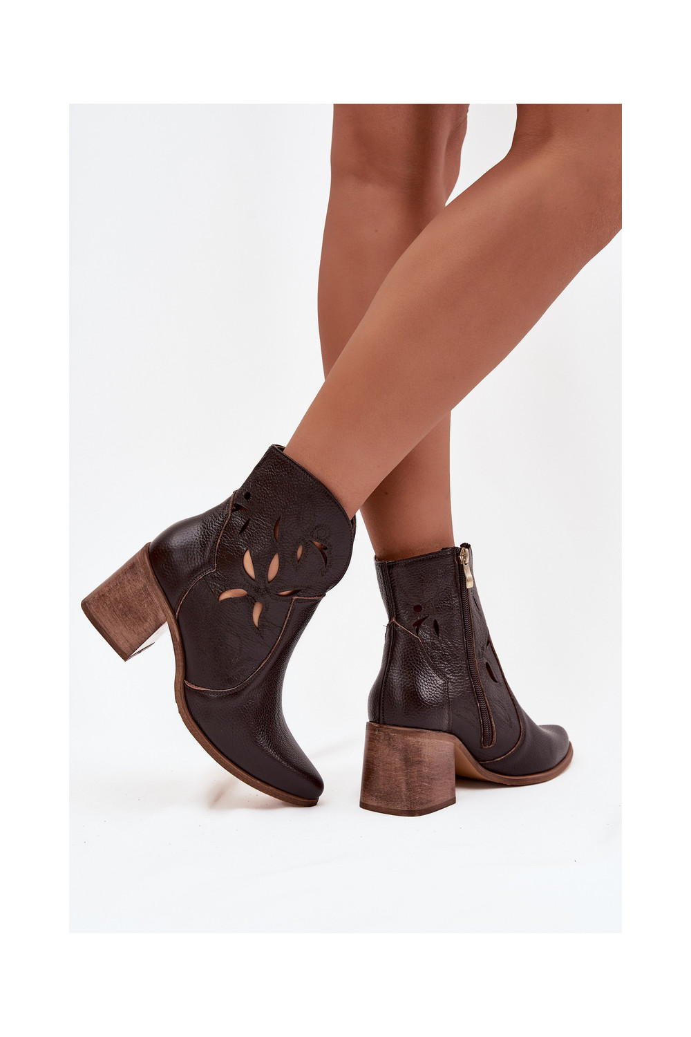 Sieviešu zābaki ar caurumiem no dabīgās ādas ar papēžiem Zazoo 3690 šokolādes krāsā