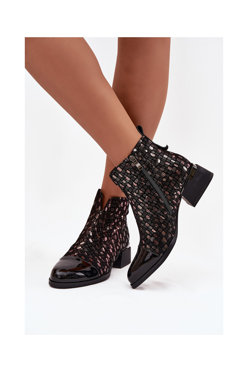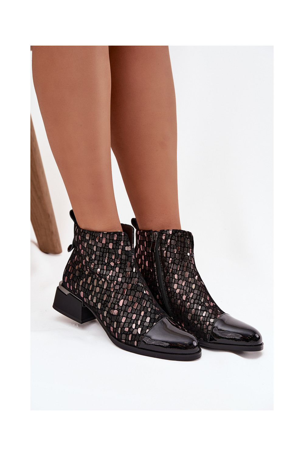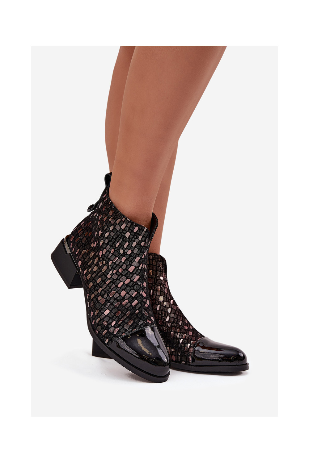 Sieviešu zābaki no dabīgās ādas ar lakota efekta uz zema papēža D&A LZ52-960 melnā krāsā