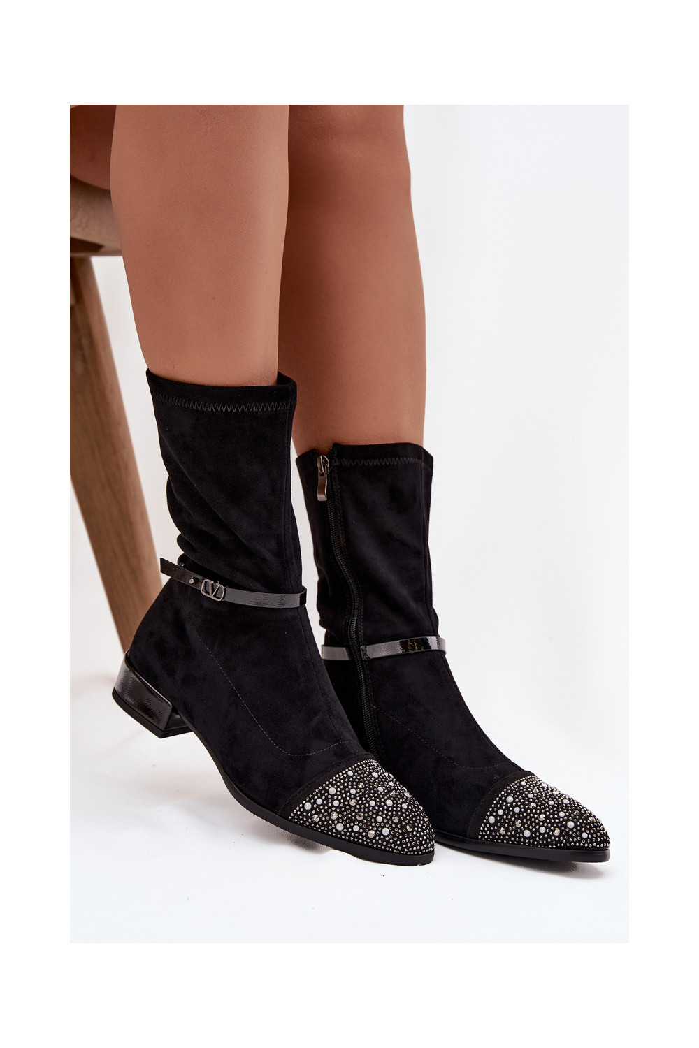 Sieviešu zābaki uz zema papēža ar dekorāciju un lentītēm D&A MR52-165 melnā krāsā
