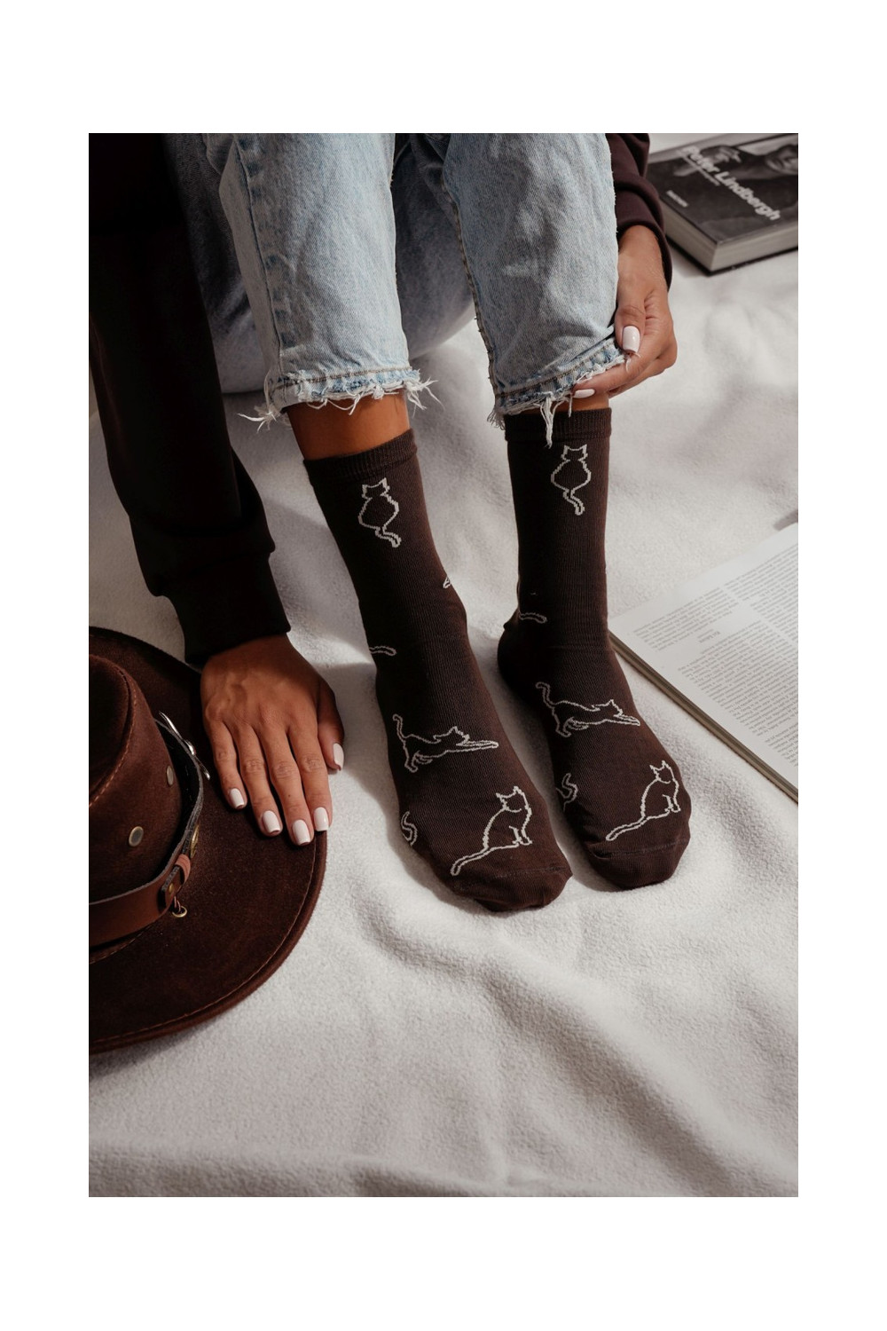 Māmišķīgas linu šokolādes krāsas zeķes „Kaķu kontūras"