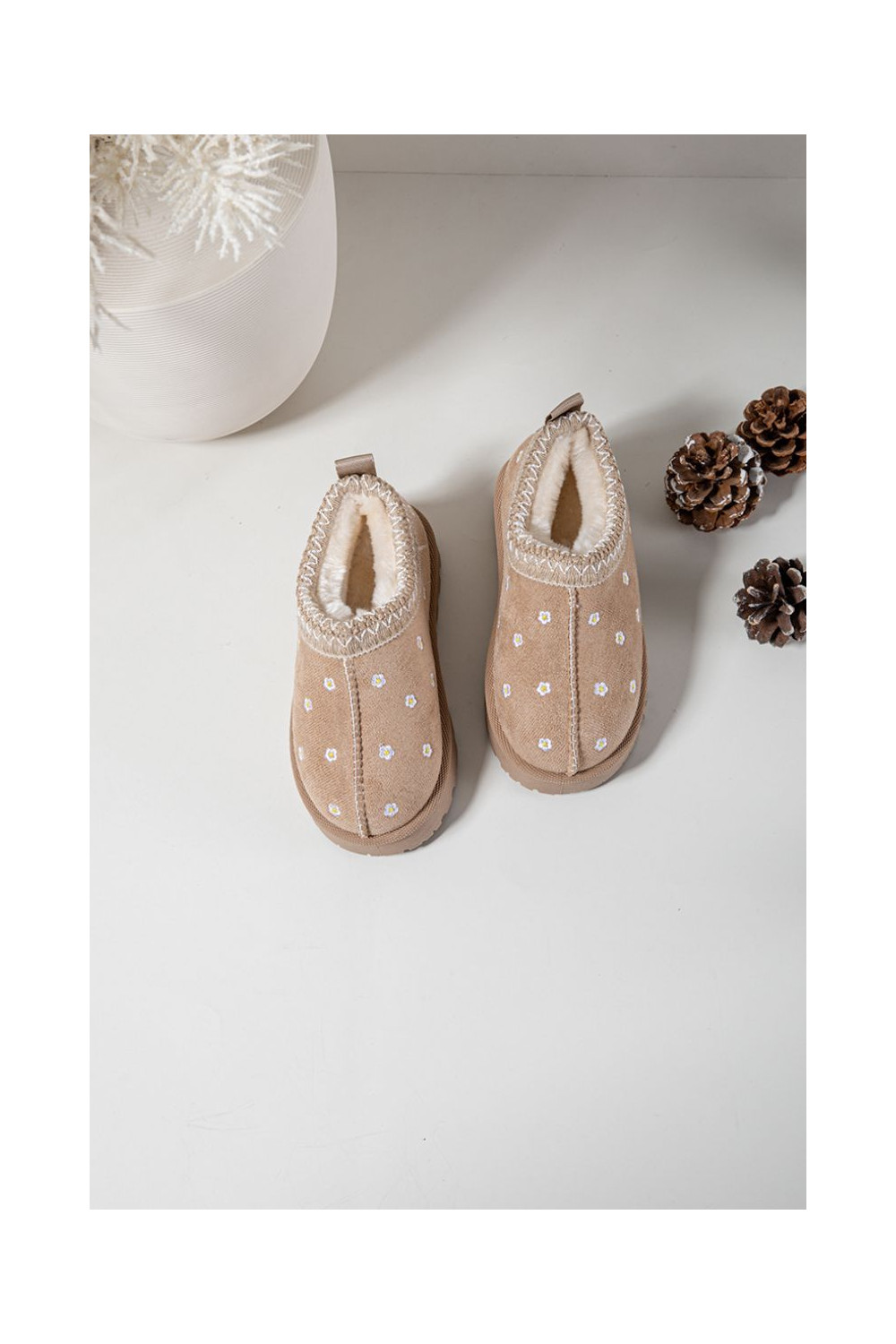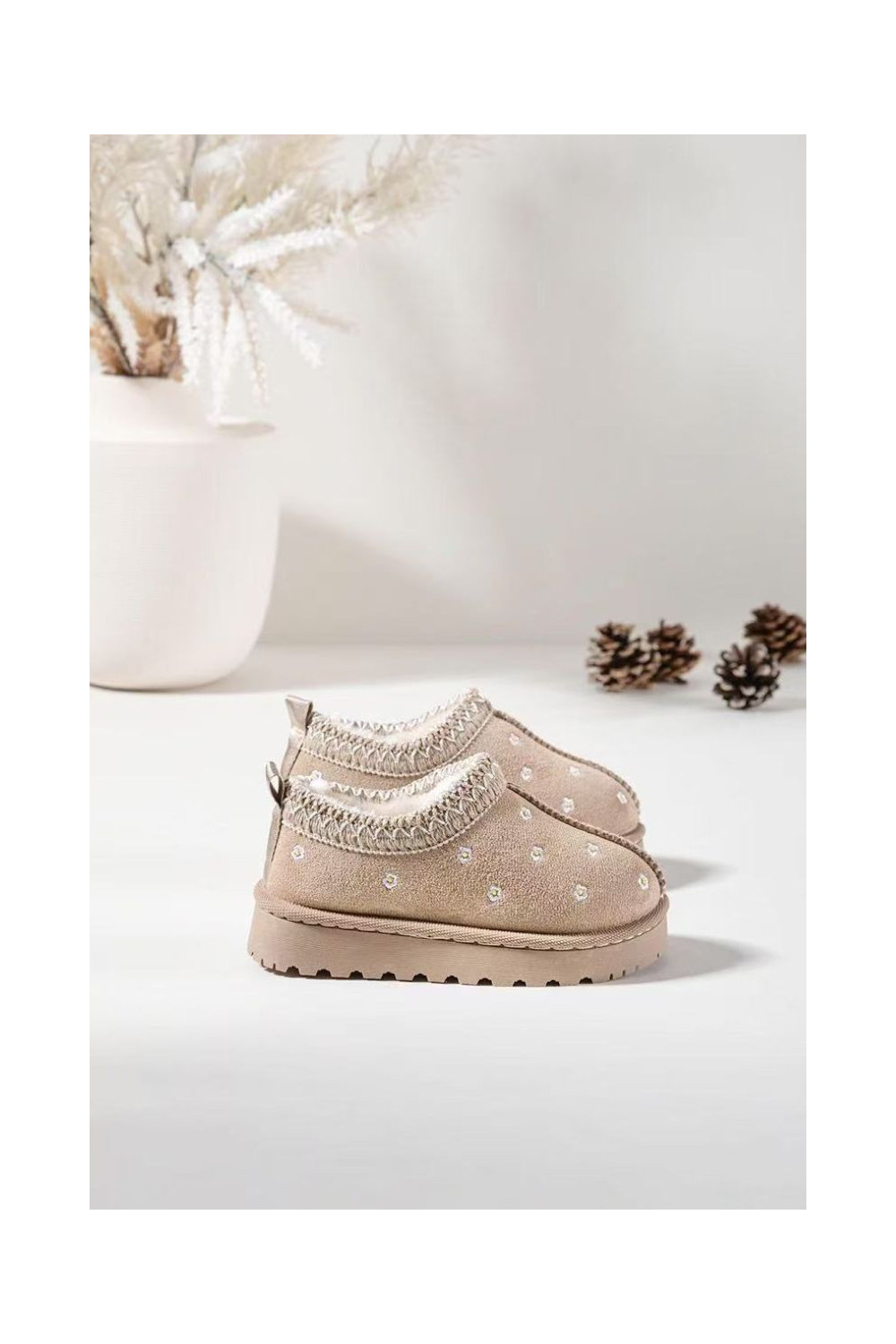 Bērnu sniega zābaki ar ziedu motīviem un ausīm, siltināti ar vilnu iekšpusē, Palina, smilšu krāsā